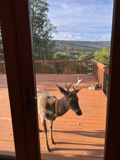 My dog by my side, anxious that this is not her home, ever watchful of a deer named Harris. But when Harris doesn’t react to her insistent barking, she is perplexed – Is this animal friend, or foe?